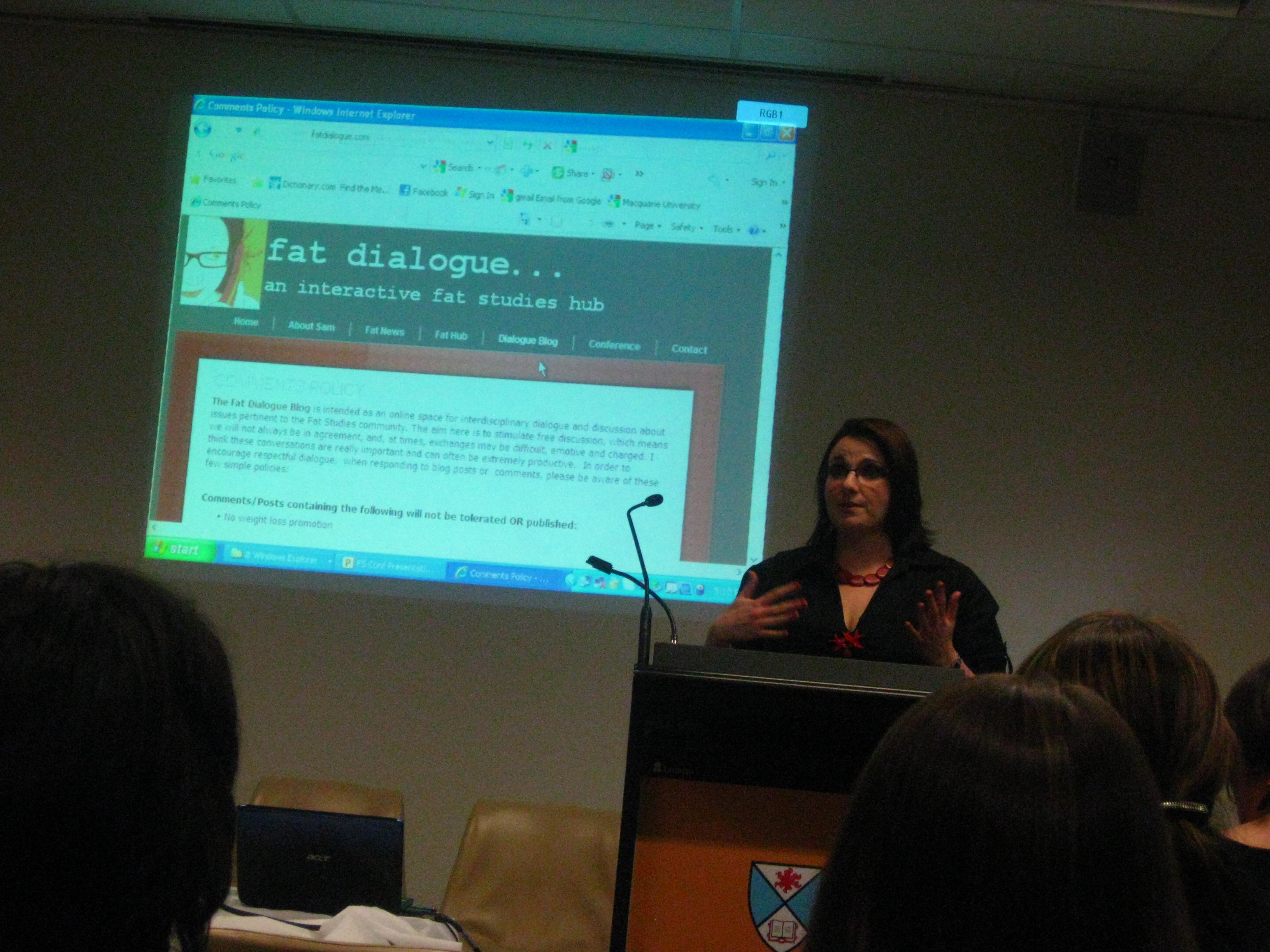 Going into this presentation, the first of the conference, I was a little nervous. I knew a lot of the presentations were focused on fat activism and body diversity, but a few were about “health interventions” like gastric banding and bypass. I can be very defensive about body minimising and reduction practices and procedures and really appreciate spaces that don’t talk about them (such as specific blogs and forums within the fat-o-sphere that uphold anti-diet talk and anti-body negativity rules).
