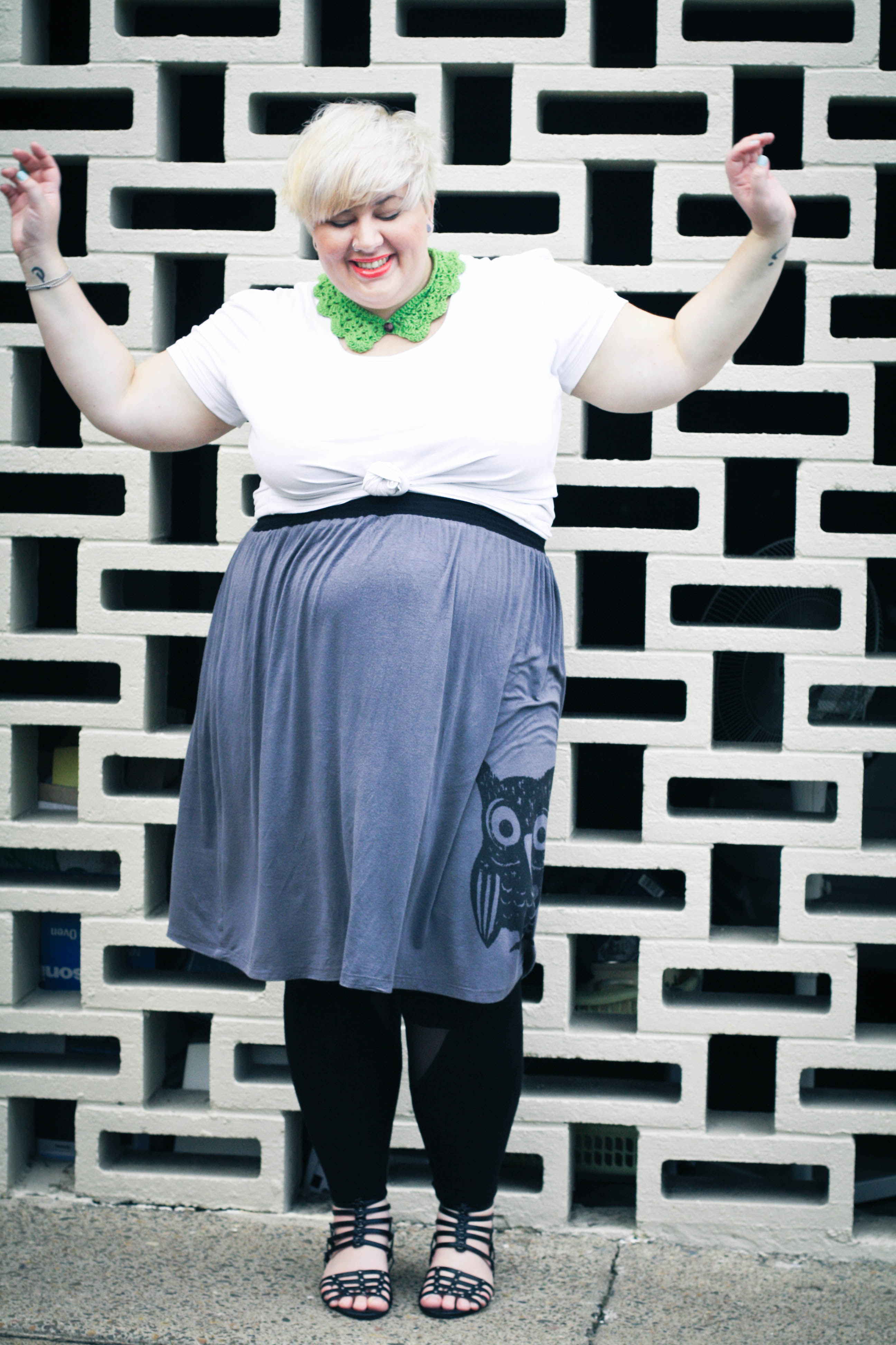 An outfit photo of me, fat and pale skinned with short blonde hair, wearing a white t-shirt knotted under my boobs over a dress with a grey skirt and black owl down the bottom with black leggings and black sandals. I also wear a green crocheted collar.