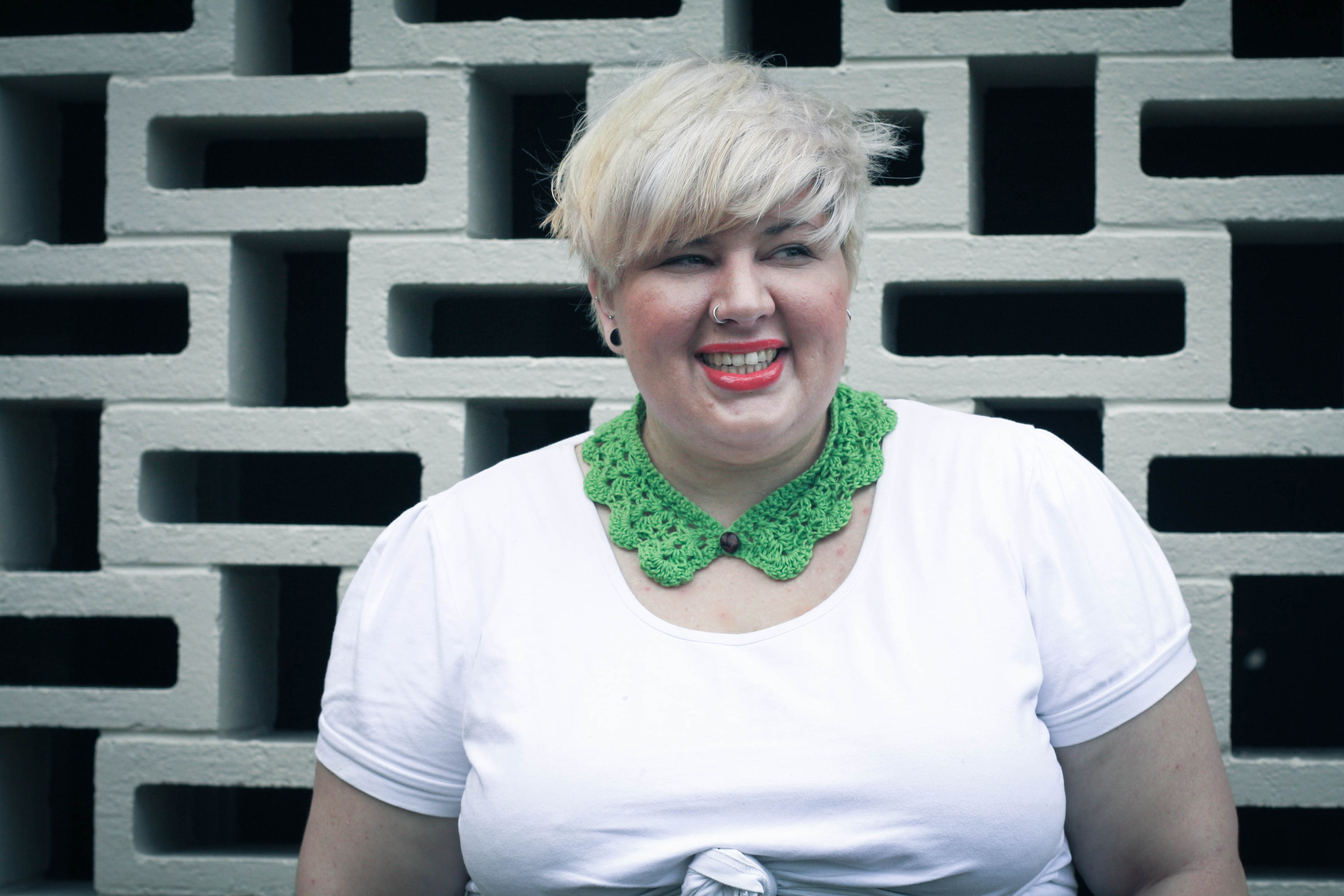 Photo of me against a brick wall wearing a white t-shirt and a green crochet collar.