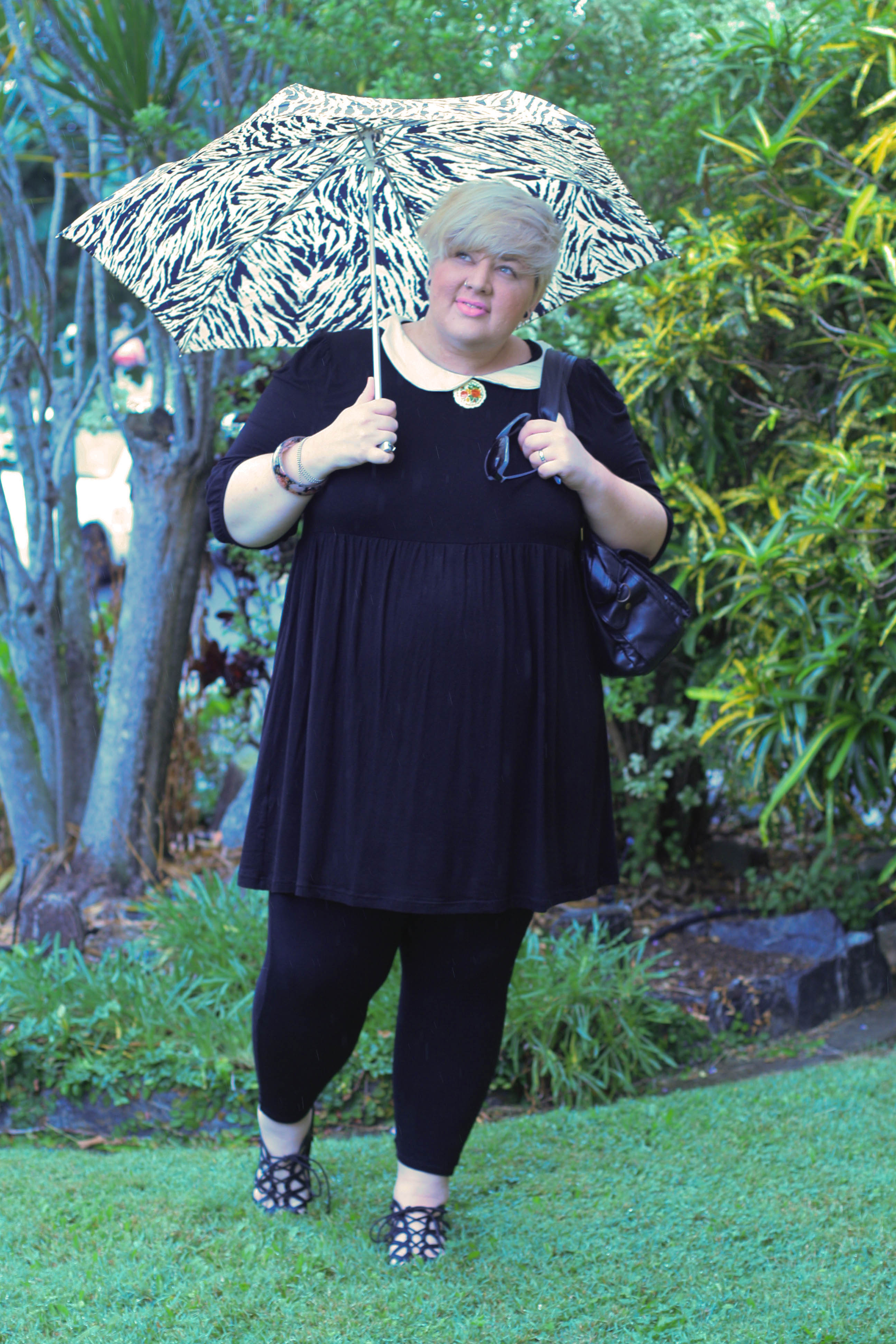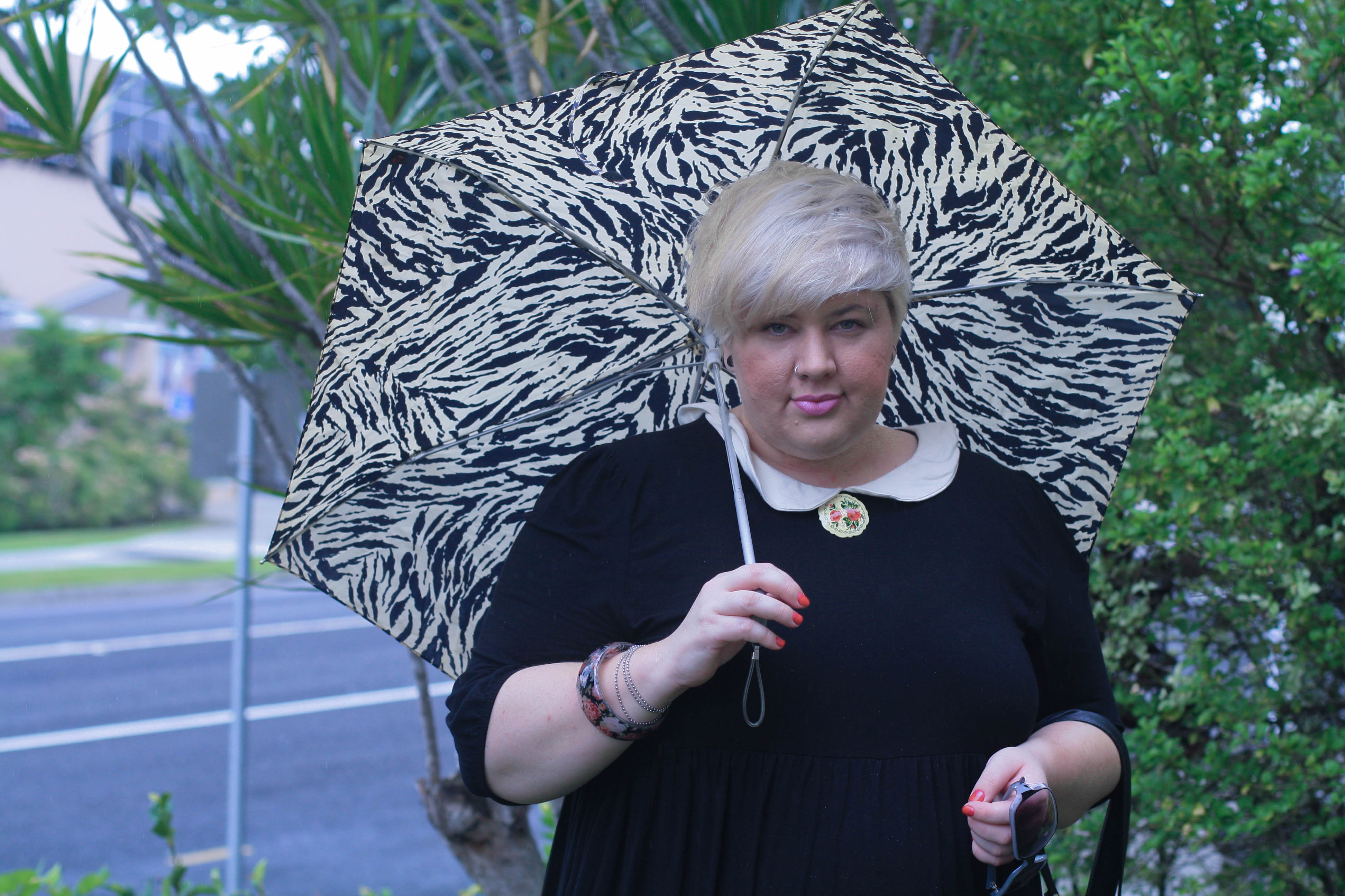 I love that dress, I’ve been craving peter pan collars recently! the brooch and umbrella are also pretty shiny!