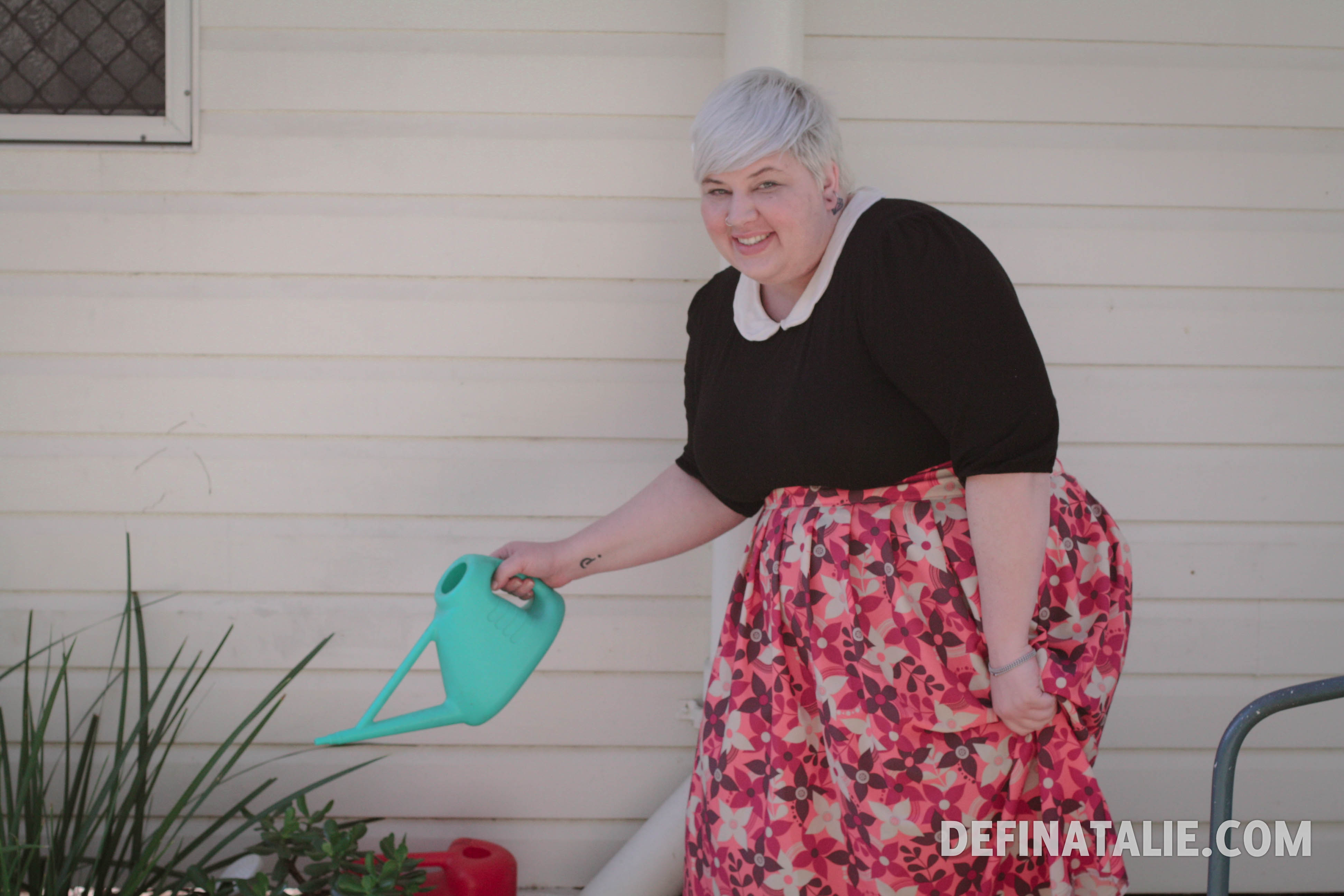 I admit I am suffering withdrawals from the awesome big hollow brick wall at our old place. It was such a good backdrop for my outfit photos and I haven’t quite found the right place to take outfit photos at this place. I doubt I’ll find a match for the big brick wall for a while so for now I’ll make to with the back of our new place which is quite lovely and almost twee with its weatherboard-clad walls and gardens beautifully tended by Sheila.